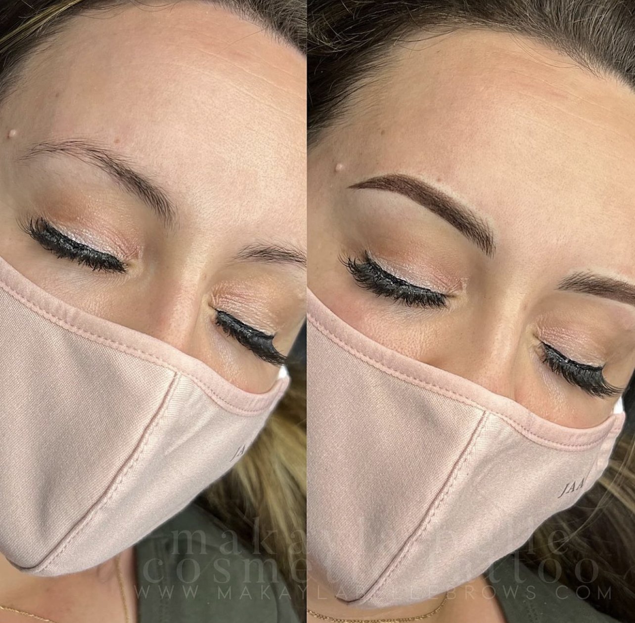 Combination brows are a mixture of two semi-permanent cosmetic tattoo techniques: Powder & Nano. Hair-like strokes done with a digital machine, and shading done with a digital machine, create a beautiful, full brow. Combo brows are customizable in style to suit the look you're going for, your skin type, and your lifestyle. Combo brows can be natural and fluffy, or bold and dramatic. We will discuss your vision of your future brows at your first session.